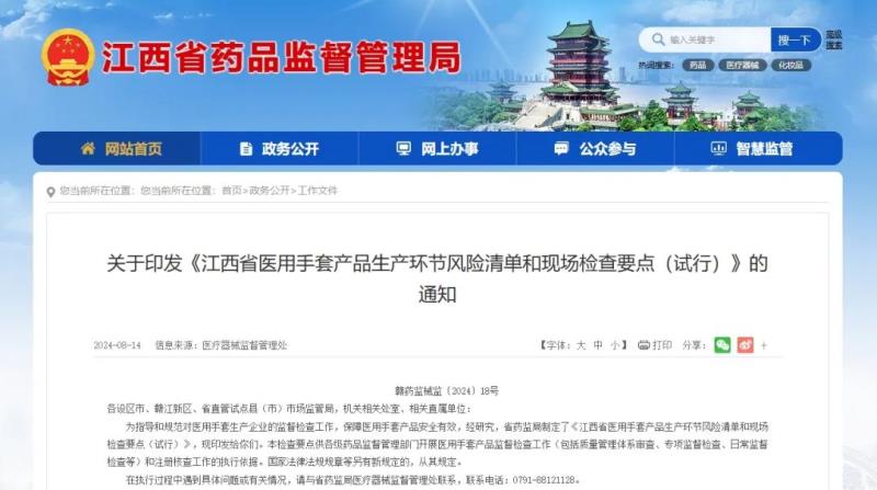 8月14日,江西省藥監(jiān)局發(fā)布《江西省醫(yī)用手套產(chǎn)品生產(chǎn)環(huán)節(jié)風(fēng)險清單和現(xiàn)場檢查要點(試行)》(以下簡稱《檢查要點》),作為各級藥品監(jiān)督管理部門開展醫(yī)用手套產(chǎn)品監(jiān)督檢查工作(包括質(zhì)量管理體系審查、專項監(jiān)督檢查、日常監(jiān)督檢查等)和注冊核查工作的執(zhí)行依據(jù)。