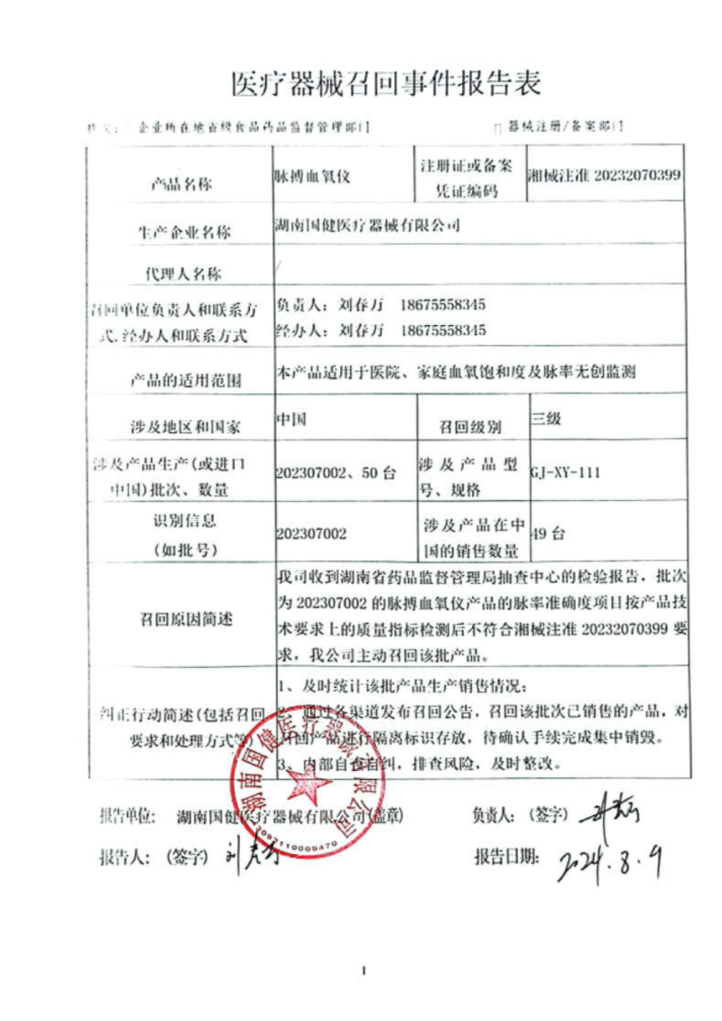 8月21日,湖南省藥監(jiān)局官網發(fā)布一則召回公告,其中提到,由于脈搏血氧儀項目不達標等原因,湖南國健醫(yī)療器械有限公司對其生產的脈搏血氧儀(產品注冊證號:湘械注準20232070399)進行主動召回。召回級別為三級。通過查看附件《醫(yī)療器械召回事件報告表》我們可以發(fā)現(xiàn),涉及產品已在中國銷售49臺。