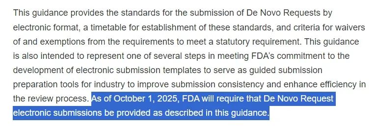 值得注意的是,該指南提到,自2025年10月1日起,De Novo申請(qǐng)需使用eSTAR進(jìn)行提交。