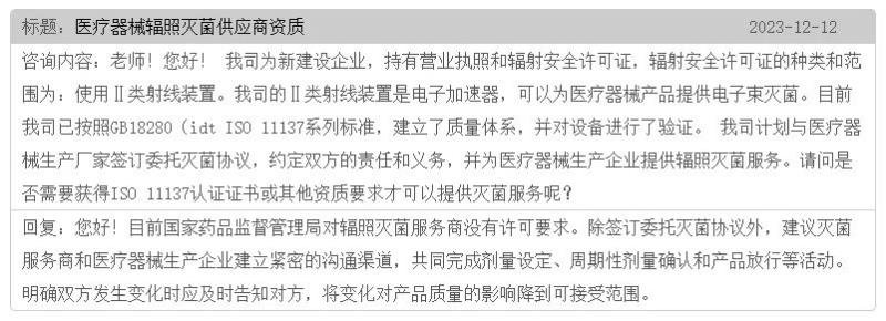 根據(jù)國家藥監(jiān)局食品藥品審核查驗中心的答復,目前國家藥品監(jiān)督管理局對輻照滅菌服務商沒有許可要求。除簽訂委托滅菌協(xié)議外,建議滅菌服務商和醫(yī)療器械生產(chǎn)企業(yè)建立緊密的溝通渠道,共同完成劑量設定、周期性劑量確認和產(chǎn)品放行等活動。明確雙方發(fā)生變化時應及時告知對方,將變化對產(chǎn)品質量的影響降到可接受范圍。