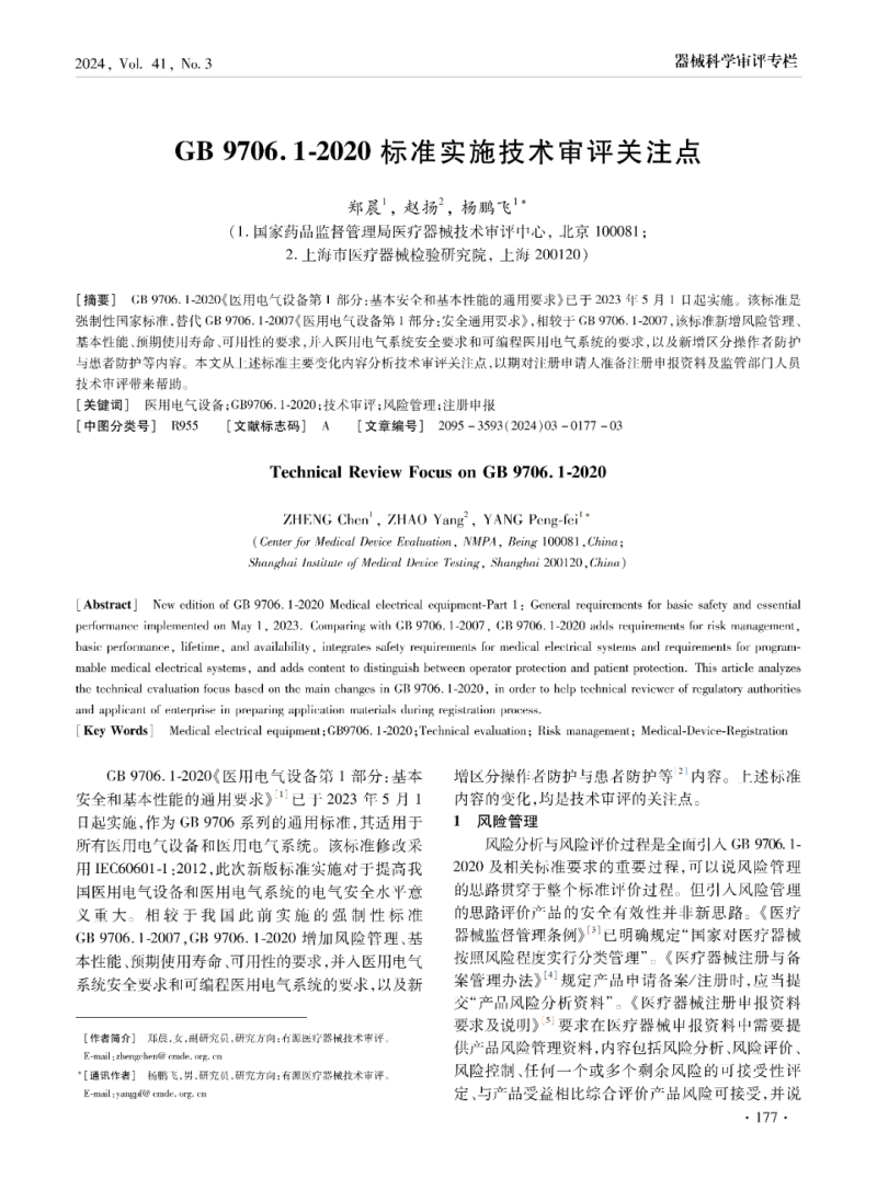 GB 9706.1-2020《醫(yī)用電氣設(shè)備第1 部分:基本安全和基本性能的通用要求》已于2023年5月1日起實施。該標(biāo)準(zhǔn)是強制性國家標(biāo)準(zhǔn),替代GB 9706.1-2007《醫(yī)用電氣設(shè)備第1部分:安全通用要求》,相較于GB 9706.1-2007,該標(biāo)準(zhǔn)新增風(fēng)險管理、基本性能、預(yù)期使用壽命、可用性的要求,并入醫(yī)用電氣系統(tǒng)安全要求和可編程醫(yī)用電氣系統(tǒng)的要求,以及新增區(qū)分操作者防護與患者防護等內(nèi)容。本文從上述標(biāo)準(zhǔn)主要變化內(nèi)容分析技術(shù)審評關(guān)注點,以期對注冊申請人準(zhǔn)備注冊申報資料及監(jiān)管部門人員技術(shù)審評帶來幫助。