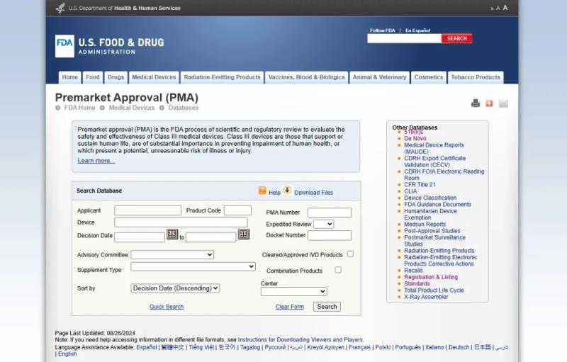 該數(shù)據(jù)庫(kù)包含所有通過(guò)PMA路徑在美國(guó)上市的高風(fēng)險(xiǎn)醫(yī)療器械的信息。