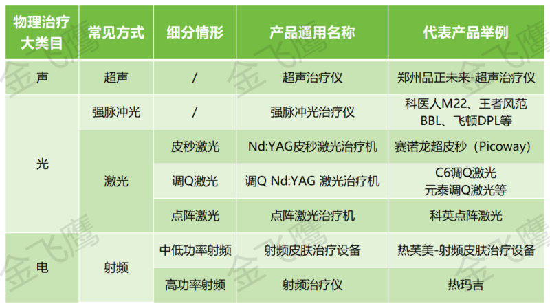 對醫(yī)療器械行業(yè)稍有了解的朋友應(yīng)該都聽過“聲光電”,這是幾種物理治療方式的簡稱,它們在醫(yī)美產(chǎn)品領(lǐng)域的應(yīng)用極為廣泛。這里的“聲”指的是超聲;“光”的形式則有多種,如激光、強脈沖光、紅藍光、紫光等,而就激光來說,又分為皮秒激光、調(diào)Q激光、點陣激光等,強脈沖光常見代表性產(chǎn)品則有M22、BBL、王者風范等;電學類產(chǎn)品最常見的則是熱瑪吉,主要利用電能作用于人體組織產(chǎn)生熱效應(yīng),以實現(xiàn)減輕皮膚皺紋等作用。
