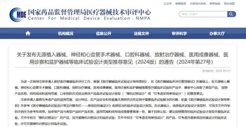 近日,國家藥監(jiān)局器審中心(以下簡稱“CMDE”)根據(jù)《醫(yī)療器械臨床試驗設計指導原則》,在《醫(yī)療器械臨床評價推薦路徑》的基礎上,在無源植入器械、神經(jīng)和心血管手術器械、口腔科器械、放射治療器械、醫(yī)用成像器械、醫(yī)用診察和監(jiān)護器械推薦開展臨床試驗的產(chǎn)品中,選取了典型產(chǎn)品, 按照產(chǎn)品名稱、結構組成和適用范圍,以舉例的方式給出具體產(chǎn)品臨床試驗設計類型(“隨機對照設計”或“可考慮采用單組設計”)的推薦意見。