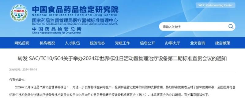 10月16日,中檢院官網(wǎng)轉(zhuǎn)發(fā)了一則標(biāo)準(zhǔn)宣貫會(huì)議通知,其中提到,全國(guó)醫(yī)用電器標(biāo)準(zhǔn)化技術(shù)委員會(huì)物理治療設(shè)備分技術(shù)委員會(huì)定于10月17日(周四)召開物理治療設(shè)備標(biāo)準(zhǔn)宣貫會(huì)(線上),具體宣貫內(nèi)容、時(shí)間及參會(huì)方式如下: