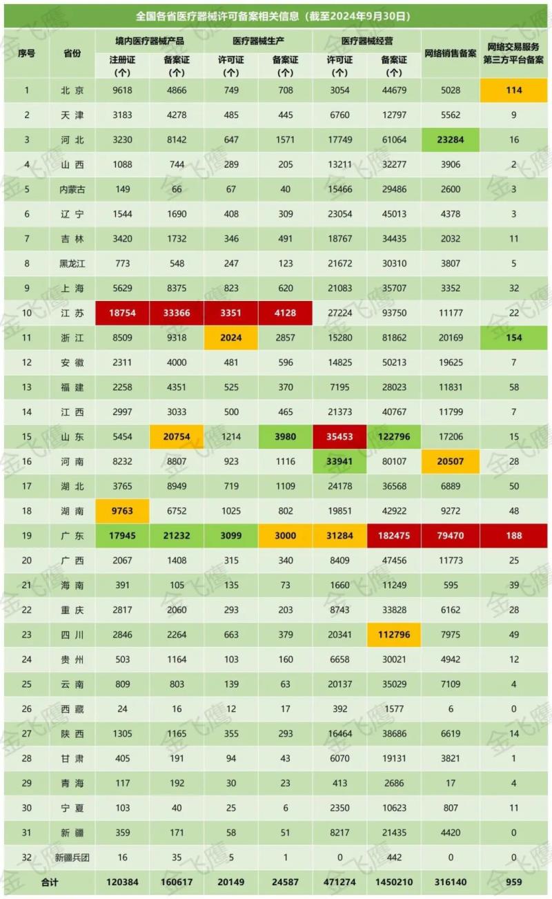 10月16日,國家藥監(jiān)局公布了截至2024年9月30日各省有效期內醫(yī)療器械產品注冊備案、醫(yī)療器械生產企業(yè)許可備案等信息,老規(guī)矩,金飛鷹小編對此稍作編輯,標注紅色、綠色、黃色的分別為前三甲。