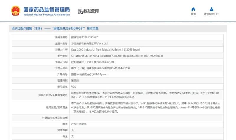 近日,國家藥監(jiān)局發(fā)布公告稱,2024年9月,國家藥監(jiān)局共批準(zhǔn)注冊醫(yī)療器械產(chǎn)品444個(gè)。在批準(zhǔn)注冊的產(chǎn)品清單附件中,有一款進(jìn)口第三類醫(yī)療器械引起了我們的注意——強(qiáng)脈沖光射頻治療儀。我們通過檢索附件中公布的注冊證編號發(fā)現(xiàn),該產(chǎn)品的注冊人是以色列華諾美容科技有限公司Viora Ltd.,國內(nèi)代理人則是華東醫(yī)藥的子公司欣可麗美學(xué)(上海)醫(yī)療科技有限公司。