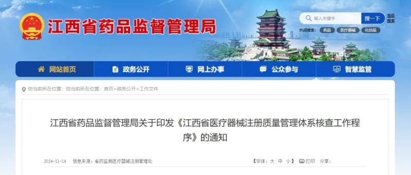 11月14日,江西省藥監(jiān)局發(fā)布《江西省醫(yī)療器械注冊質(zhì)量管理體系核查工作程序》(以下簡稱《工作程序》),并指出,《江西省藥品監(jiān)督管理局關(guān)于印發(fā)〈江西省醫(yī)療器械注冊質(zhì)量管理體系核查工作程序〉的通知》(贛藥監(jiān)規(guī)〔2022〕12號)同時廢止。