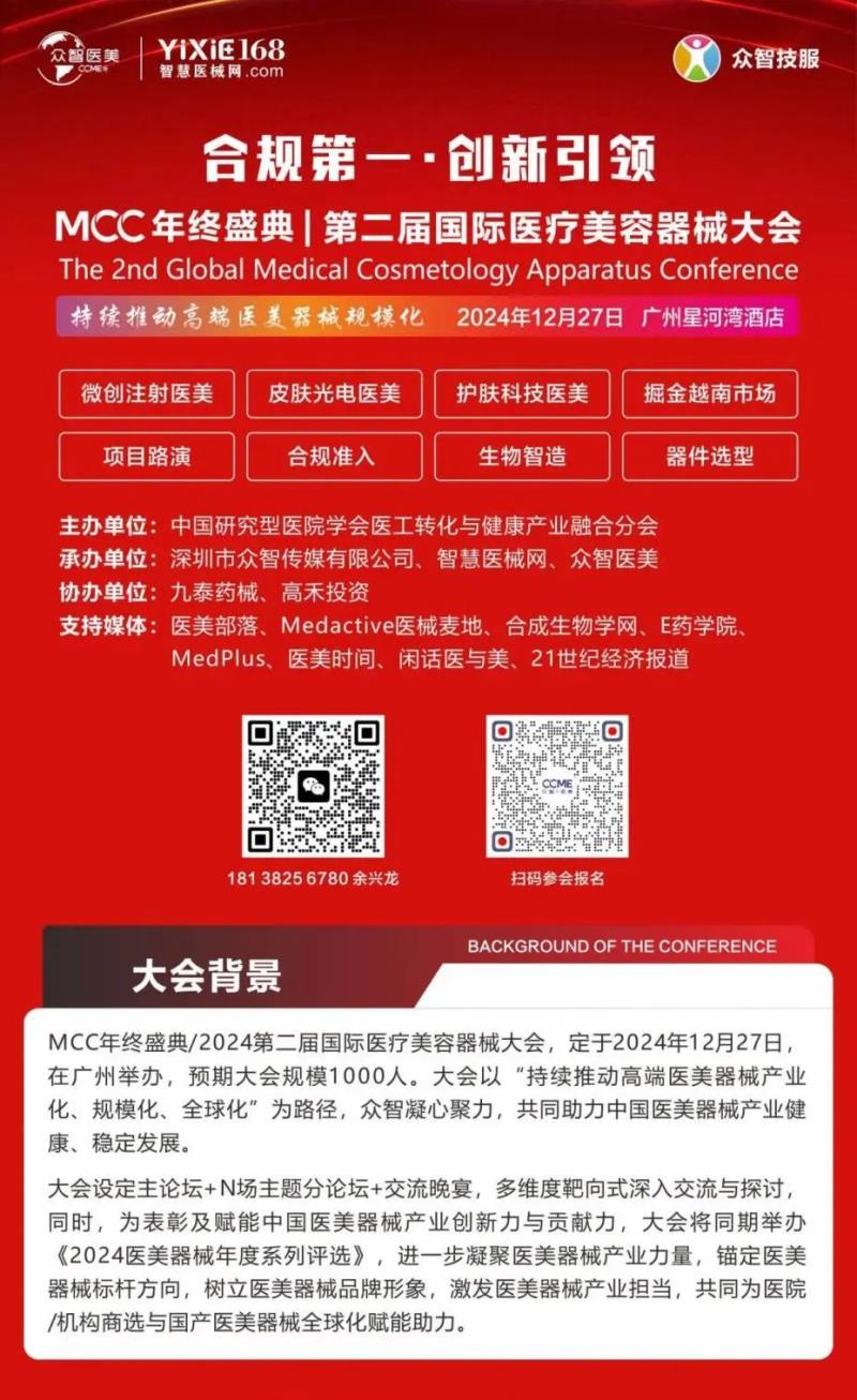 2024年12月27日,MCC年終盛典/2024第二屆國際醫(yī)療美容器械大會將在廣州星河灣酒店隆重舉辦。本屆大會以“持續(xù)推動(dòng)高端醫(yī)美器械產(chǎn)業(yè)化、規(guī)?;?、全球化”為主題,眾智凝心聚力,共同助力中國醫(yī)美器械產(chǎn)業(yè)健康、穩(wěn)定發(fā)展。