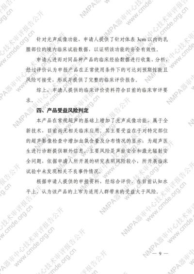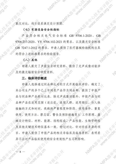 產(chǎn)品利用超聲回波及多普勒等原理,實(shí)現(xiàn)對人體組織的超聲成像。產(chǎn)品具有多種不同的成像模式和后處理功能,不涉及深度學(xué)習(xí)算法??蛇x配不同型號(hào)的探頭以及穿刺架、耦合劑加熱器等不同部件。 除常規(guī)超聲功能外,本產(chǎn)品還具有光聲成像功能,在線陣探頭的基礎(chǔ)上增加同步輸出的近紅外激光,當(dāng)組織被激光照射吸收光的部分能量后產(chǎn)生熱膨脹,并以特定機(jī)械波的形式釋放出去從而產(chǎn)生相應(yīng)頻率的超聲信號(hào),探頭接受該信號(hào)傳輸?shù)街鳈C(jī)經(jīng)過處理后將其強(qiáng)度和特征體現(xiàn)為圖像,從而反應(yīng)出組織初始的光吸收分布。由于人體組織對于不同波長的光吸收程度不同,當(dāng)前所用兩束不同波長的激光對于血紅蛋白的吸收程度不同,通過對比就可以計(jì)算出含氧血紅蛋白和不含氧血紅蛋白比例,進(jìn)而反映該區(qū)域組織中血氧的分布情況。光聲成像的結(jié)果可以和常規(guī)二維及血流的圖像融合,以反映更多的信息。