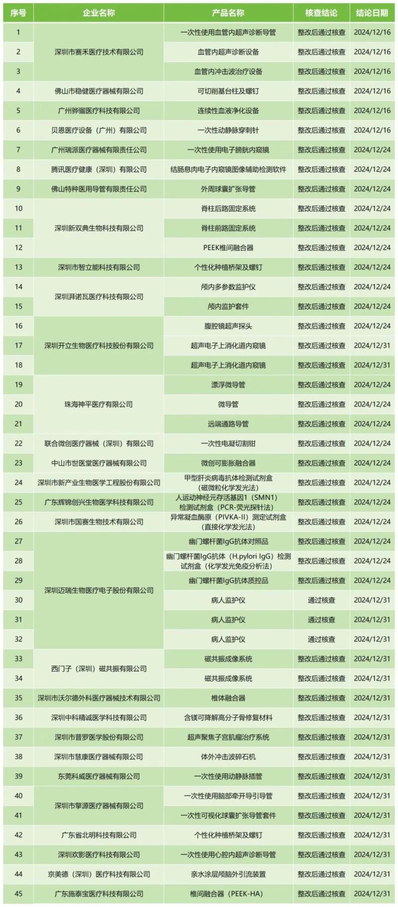 1月10日,廣東省藥監(jiān)局官網(wǎng)公布2024年12月醫(yī)療器械注冊(cè)質(zhì)量管理體系核查結(jié)果,包括佛山市穩(wěn)健醫(yī)療器械有限公司的可切削基臺(tái)柱及螺釘、騰訊醫(yī)療健康(深圳)有限公司的結(jié)腸息肉電子內(nèi)窺鏡圖像輔助檢測(cè)軟件、深圳邁瑞生物醫(yī)療電子股份有限公司的病人監(jiān)護(hù)儀等共計(jì)45款產(chǎn)品,核查結(jié)論均為“整改后通過核查”。具體明細(xì)見下方表格: