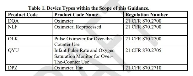 1、設(shè)備描述:設(shè)備適用范圍增加了產(chǎn)品代碼為QYU,OLK的血氧儀,其中QYU為非處方嬰兒脈率和血氧飽和度監(jiān)測(cè)儀,OLK為非處方使用的脈搏血氧儀。適用的血氧儀設(shè)備產(chǎn)品代碼見下表。
