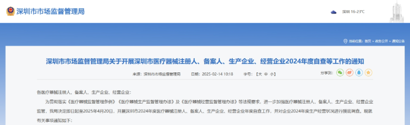 近日,深圳市市場監(jiān)督管理局發(fā)布《關于開展深圳市醫(yī)療器械注冊人、備案人、生產(chǎn)企業(yè)、經(jīng)營企業(yè)2024年度自查等工作的通知》(以下簡稱《通知》),具體內(nèi)容如下: