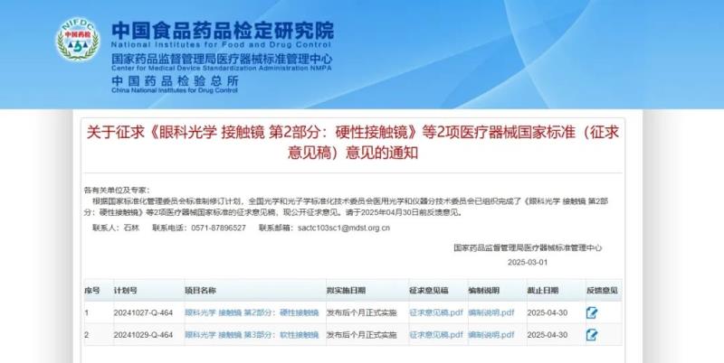 3月1日,國家藥監(jiān)局醫(yī)療器械標準管理中心發(fā)布《眼科光學(xué) 接觸鏡 第2部分:硬性接觸鏡》《眼科光學(xué) 接觸鏡 第3部分:軟性接觸鏡》共2項醫(yī)療器械國家標準的征求意見稿,并向社會公開求意見。
