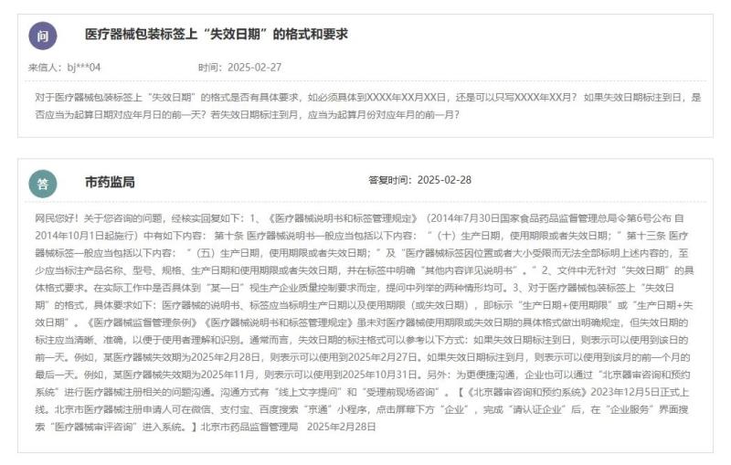 Q:對于醫(yī)療器械包裝標(biāo)簽上“失效日期”的格式是否有具體要求,如必須具體到XXXX年XX月XX日,還是可以只寫XXXX年XX月?如果失效日期標(biāo)注到日,是否應(yīng)當(dāng)為起算日期對應(yīng)年月日的前一天?若失效日期標(biāo)注到月,應(yīng)當(dāng)為起算月份對應(yīng)年月的前一月?