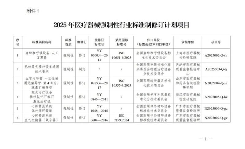 3月19日,國(guó)家藥監(jiān)局正式發(fā)布《關(guān)于印發(fā)2025年醫(yī)療器械行業(yè)標(biāo)準(zhǔn)制修訂計(jì)劃項(xiàng)目的通知》,共確定了2025年85項(xiàng)醫(yī)療器械行業(yè)標(biāo)準(zhǔn)制修訂計(jì)劃項(xiàng)目,其中包括《熱傳導(dǎo)式理療設(shè)備通用技術(shù)要求》《激光治療設(shè)備 摻鈥釔鋁石榴石激光治療機(jī)》等6項(xiàng)強(qiáng)制性醫(yī)療器械行業(yè)標(biāo)準(zhǔn)及《重組膠原蛋白降解試驗(yàn)方法通則》《接觸性創(chuàng)面敷料試驗(yàn)方法 第7部分:微生物學(xué)》《接觸性創(chuàng)面敷料試驗(yàn)方法 第8部分:生物學(xué)》等79項(xiàng)推薦性醫(yī)療器械行業(yè)標(biāo)準(zhǔn),同時(shí)明確了歸口單位及承擔(dān)單位,具體明細(xì)如下: