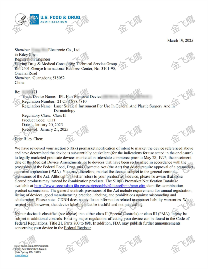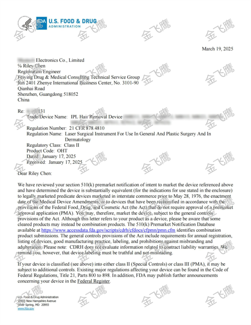 憑借我們深耕行業(yè)18年的深厚積淀與卓越的技術(shù)實力,近日金飛鷹連續(xù)輔導(dǎo)多家企業(yè)的多款產(chǎn)品獲批FDA 510(k),其中包括氣壓腿部按摩器、SGRT系統(tǒng)以及今天的主角——我們申請的首例雙脈沖脫毛儀。這一系列成功案例,不僅彰顯了我們在醫(yī)療器械注冊咨詢領(lǐng)域的專業(yè)實力和行業(yè)領(lǐng)軍地位,更為國內(nèi)醫(yī)械企業(yè)加速布局海外市場提供了堅實的技術(shù)支持與戰(zhàn)略保障。