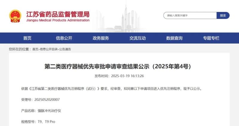 3月19日,江蘇省藥監(jiān)局發(fā)布一則第二類醫(yī)療器械優(yōu)先審批申請審查結(jié)果公示,其中提到,依據(jù)《江蘇省第二類醫(yī)療器械優(yōu)先注冊程序(試行)》要求,經(jīng)審查,擬同意大悅創(chuàng)新(蘇州)醫(yī)療科技股份有限公司申請的強脈沖光治療儀項目進(jìn)入優(yōu)先注冊程序,并予以公示。