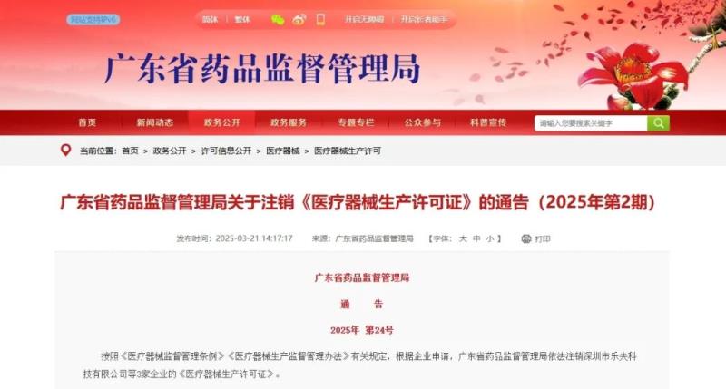 近日,廣東藥監(jiān)局發(fā)布通告稱,按照《醫(yī)療器械監(jiān)督管理條例》《醫(yī)療器械生產監(jiān)督管理辦法》有關規(guī)定,根據企業(yè)申請,該局已于依法注銷注銷深圳市樂夫科技有限公司、東莞市泰杉科技工業(yè)有限公司等3家企業(yè)的《醫(yī)療器械生產許可證》,具體明細如下: