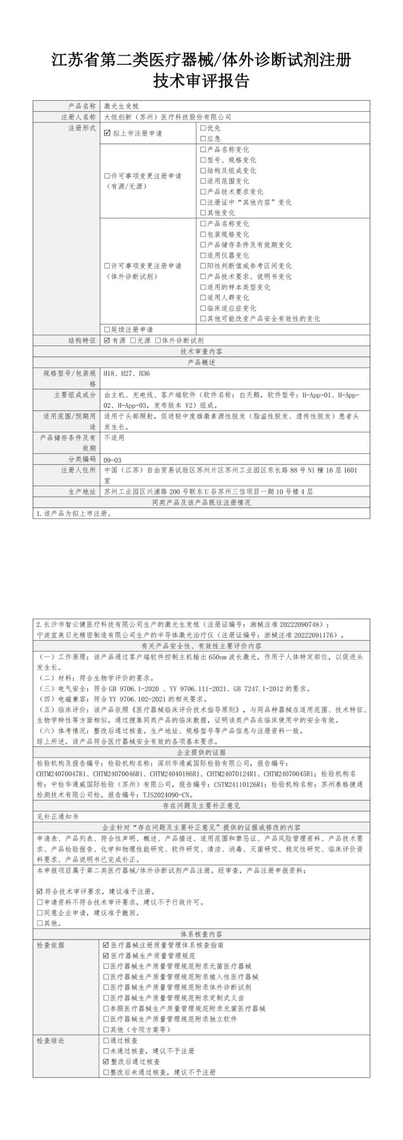 近日,江蘇省藥監(jiān)局公布了2025年3月批準(zhǔn)注冊的肺功能儀、睡眠呼吸初篩儀、全自動(dòng)艾灸儀、重組膠原蛋白液體敷料、激光生發(fā)儀、激光生發(fā)梳、重組貽貝黏蛋白液體敷料、微波理療儀、醫(yī)用分子篩制氧機(jī)等139個(gè)醫(yī)療器械產(chǎn)品目錄,同時(shí)隨附了所有產(chǎn)品的技術(shù)審評報(bào)告,我們其中“激光生發(fā)梳”[預(yù)期用途:適用于頭部照射,促進(jìn)輕中度雄激素源性脫發(fā)(脂溢性脫發(fā)、遺傳性脫發(fā))患者頭發(fā)生長]的技術(shù)審評報(bào)告以圖片形式轉(zhuǎn)載如下: