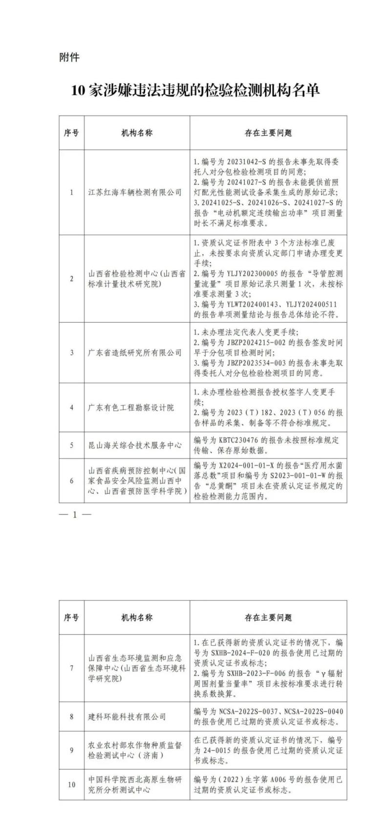 其中10家涉嫌違法違規(guī)的檢驗(yàn)檢測(cè)機(jī)構(gòu)名單如下: