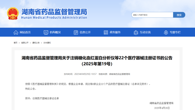4月29日,湖南省藥監(jiān)局發(fā)布公告稱,按照《醫(yī)療器械監(jiān)督管理?xiàng)l例》的規(guī)定,根據(jù)企業(yè)申請(qǐng),現(xiàn)注銷湖南普門醫(yī)療科技有限公司、湖南雷杜生物技術(shù)有限公司等8家企業(yè)的22個(gè)產(chǎn)品的醫(yī)療器械注冊(cè)證,具體明細(xì)如下:
