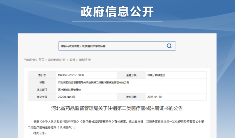 近日,河北省藥監(jiān)局發(fā)布公告稱(chēng),根據(jù)《中華人民共和國(guó)行政許可法》《醫(yī)療器械監(jiān)督管理?xiàng)l例》有關(guān)規(guī)定,依企業(yè)申請(qǐng),該局依法注銷(xiāo)了42個(gè)第二類(lèi)醫(yī)療器械注冊(cè)證書(shū),其中有12款產(chǎn)品為醫(yī)用口罩,還有一次性使用吸痰管、一次性使用霧化面罩、一次性使用聚氨酯泡沫敷料、定制式活動(dòng)義齒等,具體明細(xì)如下: