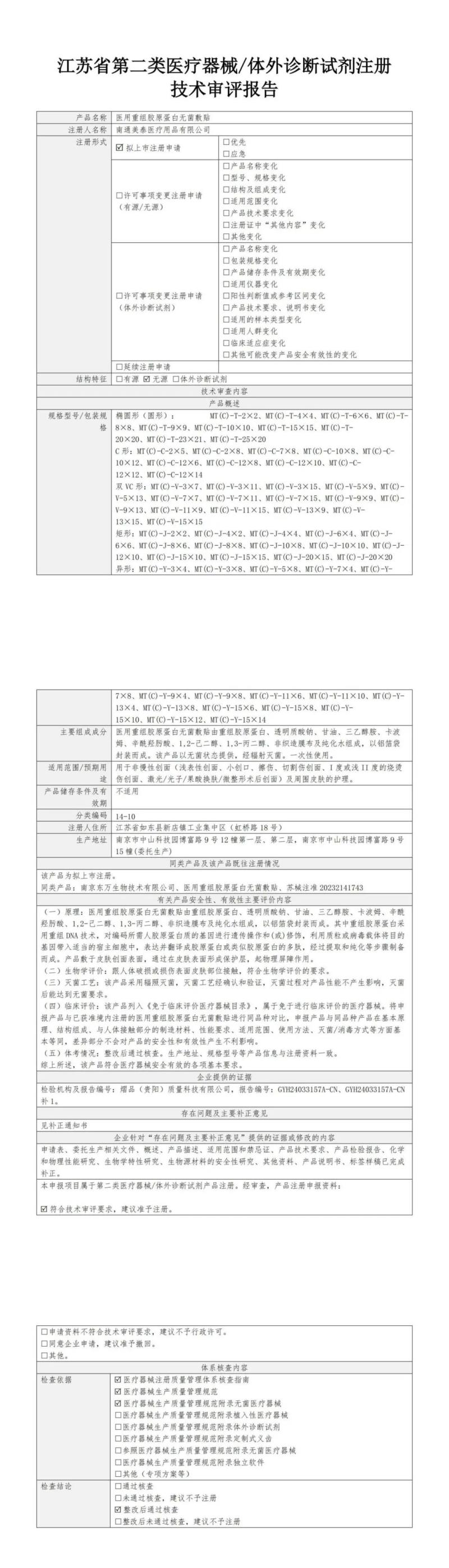 5月12日,江蘇省藥監(jiān)局公布了2025年4月批準注冊的水性聚氨酯避孕套、醫(yī)用透明質(zhì)酸鈉液體敷料、醫(yī)用重組膠原蛋白液體敷料、低頻治療儀、中頻治療儀、足底壓力步態(tài)評估系統(tǒng)、視頻可視喉鏡、超短波治療儀、增材制造肺部穿刺導(dǎo)板等224個醫(yī)療器械產(chǎn)品目錄,同時隨附了所有產(chǎn)品的技術(shù)審評報告,我們其中“醫(yī)用重組膠原蛋白無菌敷貼”[預(yù)期用途:用于非慢性創(chuàng)面(淺表性創(chuàng)面、小創(chuàng)口、擦傷、切割傷創(chuàng)面、Ⅰ度或淺Ⅱ度的燒燙傷創(chuàng)面、激光/光子/果酸換膚/微整形術(shù)后創(chuàng)面)及周圍皮膚的護理]的技術(shù)審評報告以圖片形式轉(zhuǎn)載如下: