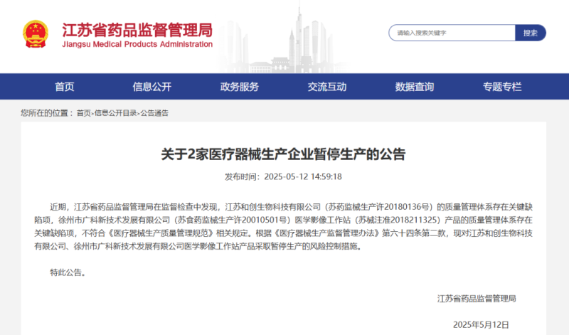 近日,江蘇省藥監(jiān)局發(fā)布公告稱,該局在監(jiān)督檢查中發(fā)現(xiàn),江蘇**生物科技有限公司(蘇藥監(jiān)械生產(chǎn)許201801**號)的質(zhì)量管理體系存在關(guān)鍵缺陷項(xiàng),徐州市**新技術(shù)發(fā)展有限公司(蘇食藥監(jiān)械生產(chǎn)許200105**號)醫(yī)學(xué)影像工作站(蘇械注準(zhǔn)20182113**)產(chǎn)品的質(zhì)量管理體系存在關(guān)鍵缺陷項(xiàng),不符合《醫(yī)療器械生產(chǎn)質(zhì)量管理規(guī)范》相關(guān)規(guī)定。根據(jù)《醫(yī)療器械生產(chǎn)監(jiān)督管理辦法》第六十四條第二款,現(xiàn)對江蘇**生物科技有限公司、徐州市**新技術(shù)發(fā)展有限公司醫(yī)學(xué)影像工作站產(chǎn)品采取暫停生產(chǎn)的風(fēng)險控制措施。