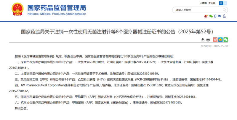 近日,國家藥監(jiān)局發(fā)布一則醫(yī)療器械注冊證注銷公告,公告顯示,該局已依法注銷深圳市保安醫(yī)療用品有限公司、深圳市科曼醫(yī)療設(shè)備有限公司等6家企業(yè)共計8個產(chǎn)品的醫(yī)療器械注冊證,包括一次性使用無菌注射針、一次性使用等離子手術(shù)電極、黃疸治療儀等產(chǎn)品,具體如下: