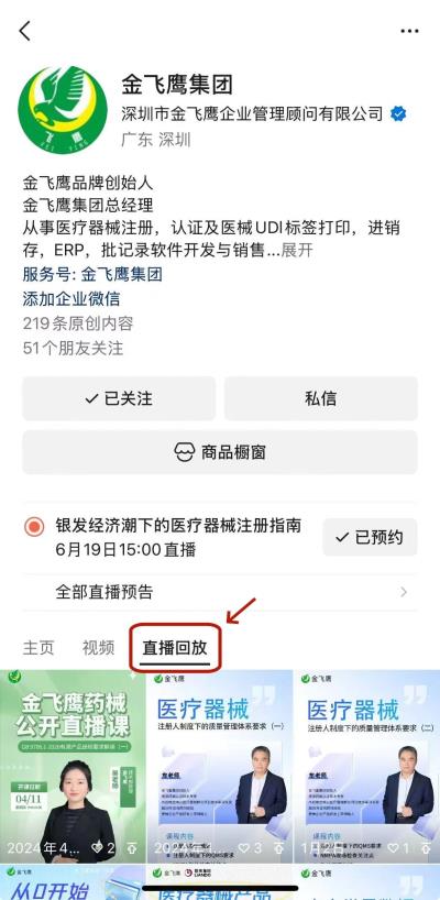 往期直播培訓(xùn)課程支持回放,關(guān)注“金飛鷹藥械咨詢服務(wù)”視頻號(hào)并點(diǎn)擊視頻號(hào)主頁,即可查看“直播回放”哦~