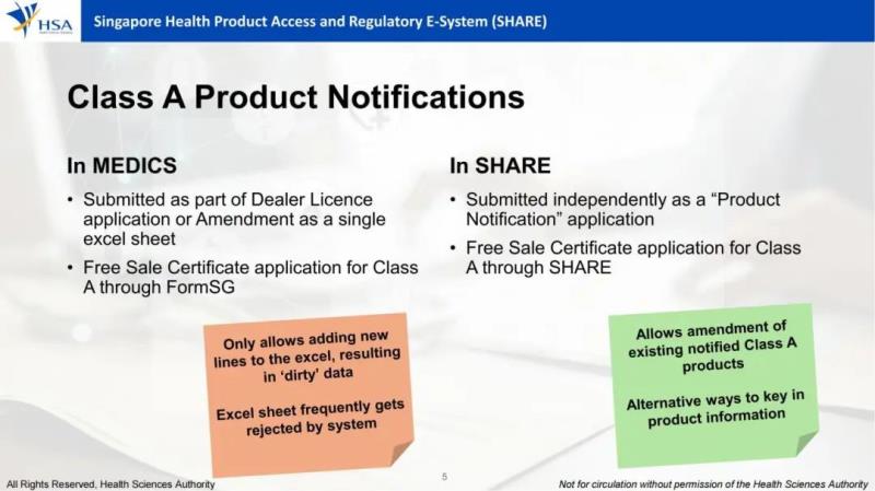 ↑ 在MEDICS系統(tǒng)中,A類產(chǎn)品通知作為經(jīng)銷商許可證申請或變更的組成部分,通過單一Excel表格提交,產(chǎn)品自由銷售證書需通過FormSG申請;而在SHARE中,A類產(chǎn)品通知作為獨立的“產(chǎn)品通知”申請?zhí)峤唬a(chǎn)品自由銷售證書可直接通過SHARE申請。