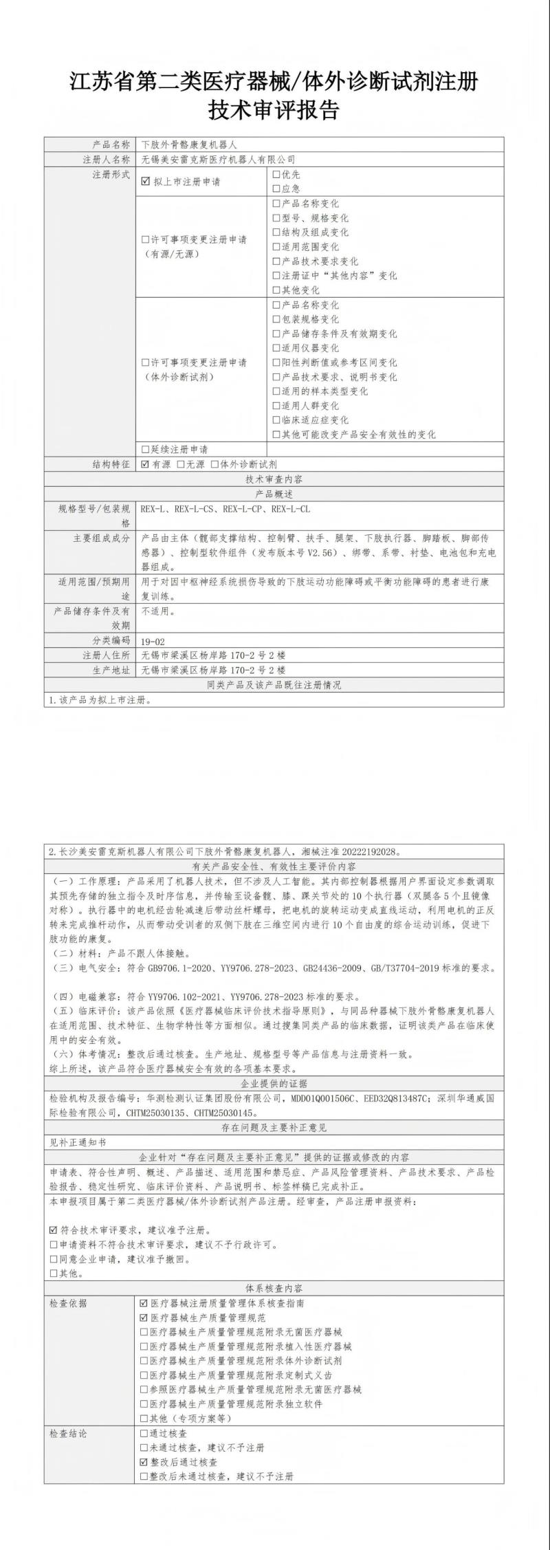 近日,江蘇省藥監(jiān)局公布了2025年5月批準(zhǔn)注冊(cè)的磁刺激治療儀、重組膠原蛋白液體敷料、生命體征檢測(cè)儀、一次性使用無(wú)菌皮膚滾針、短波治療儀、艾灸儀、醫(yī)用透明質(zhì)酸鈉凝膠敷料、下肢外骨骼康復(fù)機(jī)器人等164個(gè)醫(yī)療器械產(chǎn)品目錄,同時(shí)隨附了所有產(chǎn)品的技術(shù)審評(píng)報(bào)告,我們其中“下肢外骨骼康復(fù)機(jī)器人”(預(yù)期用途:用于對(duì)因中樞神經(jīng)系統(tǒng)損傷導(dǎo)致的下肢運(yùn)動(dòng)功能障礙或平衡功能障礙的患者進(jìn)行康復(fù)訓(xùn)練)的技術(shù)審評(píng)報(bào)告以圖片形式轉(zhuǎn)載如下: