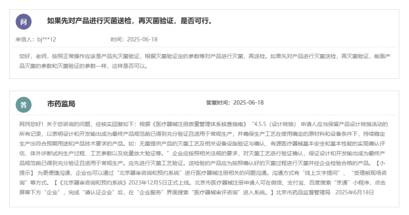 根據(jù)北京市藥監(jiān)局的答復,根據(jù)《醫(yī)療器械注冊質(zhì)量管理體系核查指南》“4.5.5(設計轉(zhuǎn)換) 申請人應當保留產(chǎn)品設計轉(zhuǎn)換活動的所有記錄,以表明設計和開發(fā)輸出成為最終產(chǎn)品規(guī)范前已得到充分驗證且適用于常規(guī)生產(chǎn),并確保生產(chǎn)工藝在使用確定的原材料和設備條件下,持續(xù)穩(wěn)定生產(chǎn)出符合預期用途和產(chǎn)品技術(shù)要求的產(chǎn)品。如:無菌提供產(chǎn)品的滅菌工藝及相關(guān)設備設施驗證與確認、有源醫(yī)療器械基本安全和基本性能的實現(xiàn)確認評估、體外診斷試劑生產(chǎn)過程、工藝參數(shù)以及批量放大驗證等?!逼髽I(yè)應按照相關(guān)法規(guī)的要求,對滅菌工藝進行驗證確認,保證設計和開發(fā)輸出成為最終產(chǎn)品規(guī)范前已得到充分驗證且適用于常規(guī)生產(chǎn)。應先進行滅菌工藝驗證。送檢驗的產(chǎn)品應為按照確認好的滅菌過程進行滅菌并經(jīng)企業(yè)檢驗合格的產(chǎn)品。