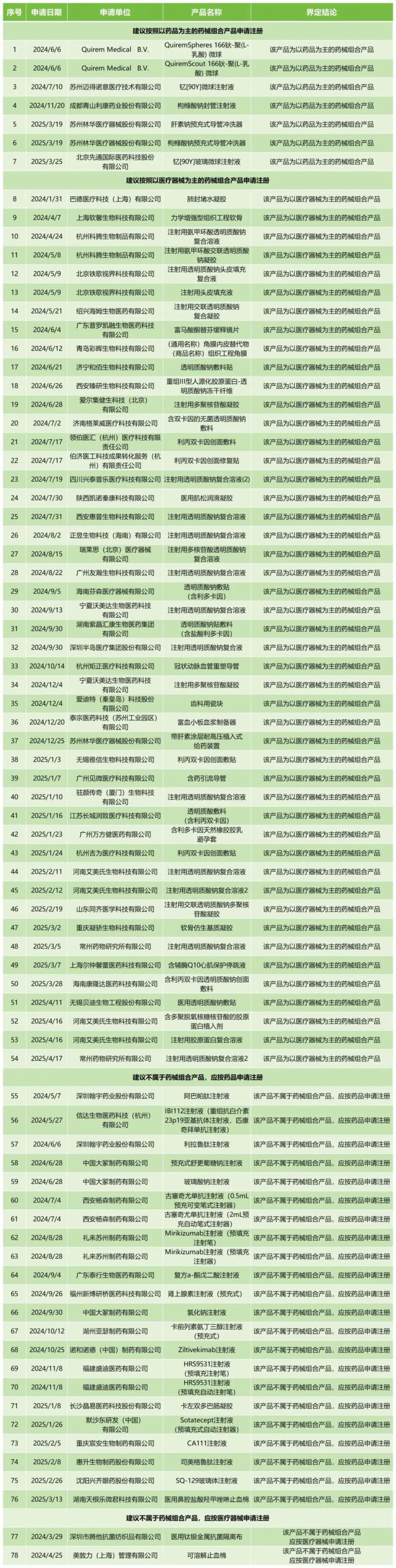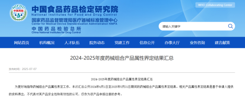 7月7日,中檢院匯總公開了2024年6月1日至2025年5月31日期間的藥械組合產(chǎn)品屬性界定結(jié)果,共包含78款產(chǎn)品,其中建議按照以藥品為主的藥械組合產(chǎn)品申請注冊有7款,建議按照以醫(yī)療器械為主的藥械組合產(chǎn)品申請注冊有47款,建議應按藥品申請注冊的有22款,建議應按醫(yī)療器械申請注冊有2款,具體明細如下: