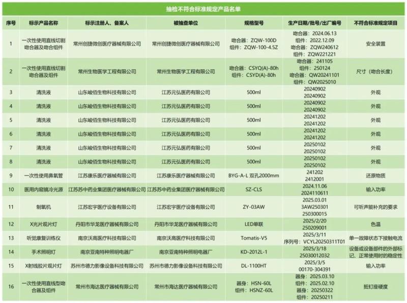 近日,江蘇省藥監(jiān)局發(fā)布《江蘇省2025年第1期醫(yī)療器械監(jiān)督抽檢結(jié)果的通告》,共通告了一次性使用直線切割吻合器及吻合組件、一次性使用鼻氧管、制氧機(jī)、聽(tīng)覺(jué)康復(fù)訓(xùn)練儀等16批次不符合規(guī)定醫(yī)療器械產(chǎn)品,具體明細(xì)如下: