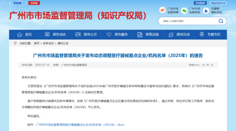 7月10日,廣州市市場監(jiān)督管理局發(fā)布了動態(tài)調(diào)整后的醫(yī)療器械重點(diǎn)企業(yè)/機(jī)構(gòu)名單(2025年),共有廣州邁普再生醫(yī)學(xué)科技股份有限公司、廣州萬孚生物技術(shù)股份有限公司、廣州衛(wèi)視博生物科技有限公司、廣州科萊瑞迪醫(yī)療器材股份有限公司等108家企業(yè)上榜,而根據(jù)《廣州市市場監(jiān)督管理局關(guān)于組織實(shí)施2025年度廣州市醫(yī)療器械注冊申報(bào)前置技術(shù)服務(wù)項(xiàng)目的通知》,上榜企業(yè)可享受醫(yī)療器械注冊申報(bào)前置技術(shù)服務(wù),具體如下: