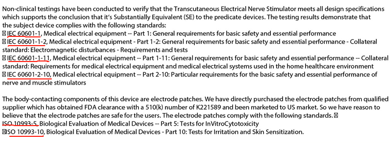 有源部分(安規(guī)&EMC)主要涉及的標(biāo)準(zhǔn)有IEC 60601-1、IEC 60601-1-2、IEC 60601-1-11、IEC 60601-2-10;而生物學(xué)部分(針對(duì)電極片)足以涉及的是ISO 10993-5(細(xì)胞毒性)、ISO 10993-10(皮膚刺激)。