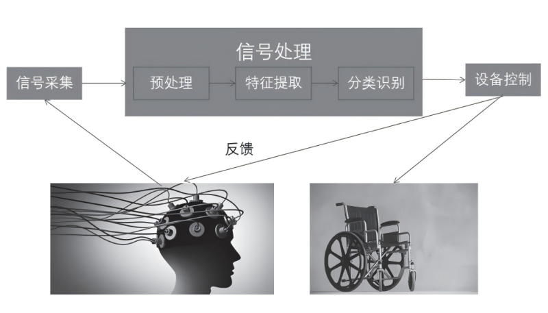 20世紀(jì)70年代初,美國(guó)加州大學(xué)洛杉磯分校的計(jì)算機(jī)科學(xué)教授雅克·維達(dá)爾(Jacques Vidal)首次提出了“腦機(jī)接口”這一名詞 。經(jīng)過數(shù)十年的發(fā)展,腦機(jī)接口已逐漸成為電腦通信技術(shù)的新種類之一。其基本原理是,人們使用腦機(jī)接口收集腦電信號(hào),利用腦電信號(hào)控制電腦程序。目前,腦機(jī)接口技術(shù)已經(jīng)取得了諸多突破并且在多個(gè)領(lǐng)域得到應(yīng)用和推廣,尤其是在康復(fù)醫(yī)學(xué)領(lǐng)域。有研究表明,腦機(jī)接口可通過患者的運(yùn)動(dòng)想象來刺激大腦皮層相關(guān)區(qū)域,然后利用收集到的腦電信號(hào)來啟動(dòng)功能性電刺激,并以此來刺激受損的肌肉神經(jīng),患者可以利用此電刺激主動(dòng)參與發(fā)力,以達(dá)到改善運(yùn)動(dòng)功能的效果。腦機(jī)接口的工作原理可以分為信號(hào)采集、信號(hào)處理、控制設(shè)備和反饋 4 個(gè)部分,具體如下。