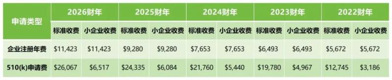 具體來說,企業(yè)注冊年費(fèi)漲至$11423,相比2025財年的$9280上漲了$2143,漲幅23.1%;相比而言,510(k)申請費(fèi)的漲幅則要稍小一些:其中510(k)申請標(biāo)準(zhǔn)收費(fèi)漲至$26067,小企業(yè)的510(k)申請費(fèi)則為6517美元,漲幅均為7.1%。