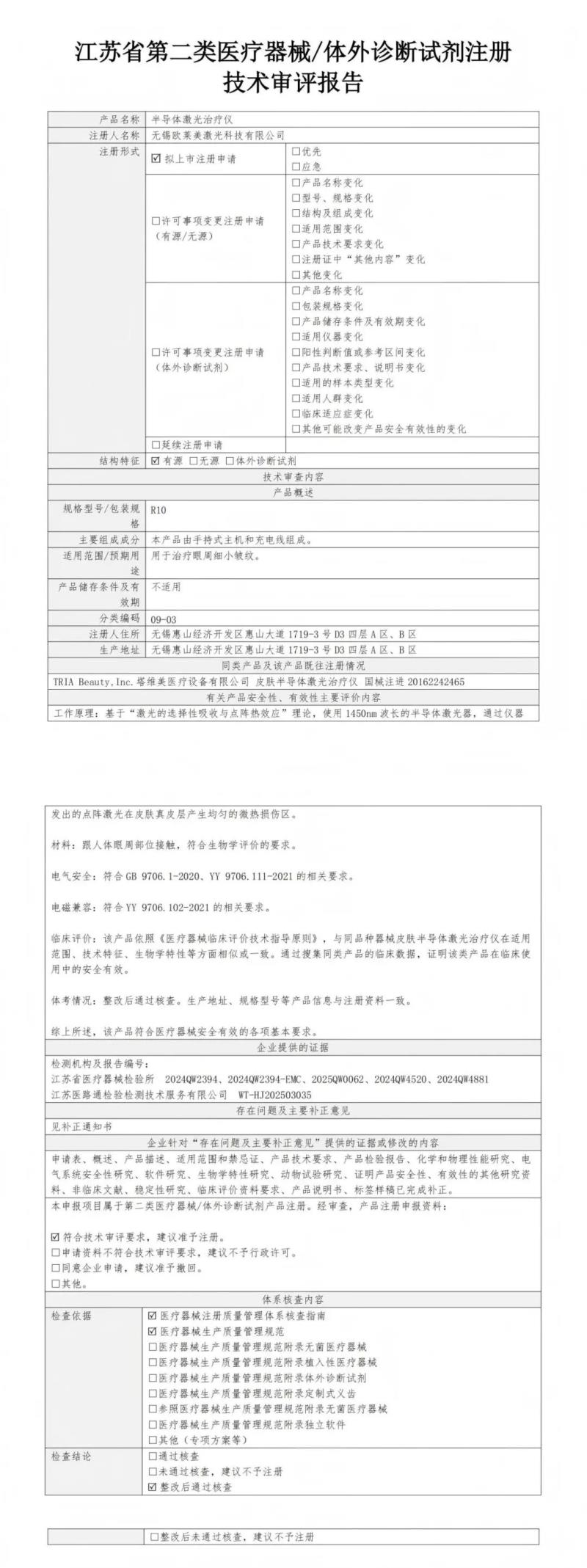 8月12日,江蘇省藥監(jiān)局公布了2025年7月批準注冊的神經(jīng)肌肉電刺激儀、醫(yī)用分子篩制氧機、半導(dǎo)體激光治療儀、紅藍光治療儀、全自動沖擊波治療儀、醫(yī)用絲素蛋白凝膠敷料、超聲波治療儀、醫(yī)用重組膠原蛋白液體敷料、醫(yī)用壓縮式霧化器、一次性醫(yī)用激光光纖等136個醫(yī)療器械產(chǎn)品目錄,同時隨附了所有產(chǎn)品的技術(shù)審評報告,我們將其中“半導(dǎo)體激光治療儀”(預(yù)期用途:用于治療眼周細小皺紋)的技術(shù)審評報告以圖片形式轉(zhuǎn)載如下: