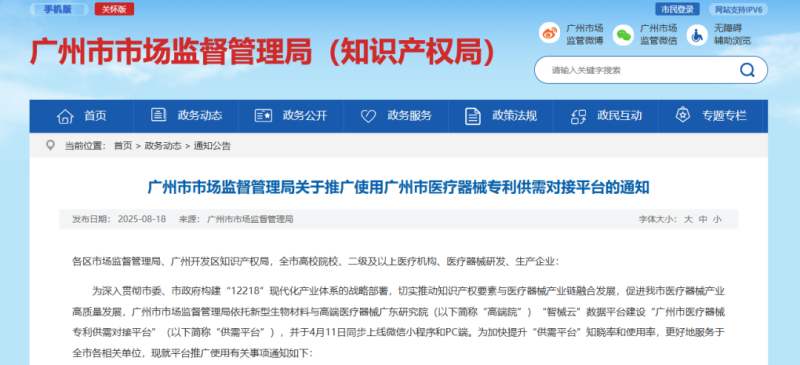 8月18日,廣州市市場監(jiān)督管理局發(fā)布《關(guān)于推廣使用廣州市醫(yī)療器械專利供需對(duì)接平臺(tái)的通知》(以下簡稱《通知》),《通知》提到,該局依托新型生物材料與高端醫(yī)療器械廣東研究院(以下簡稱“高端院”)“智械云”數(shù)據(jù)平臺(tái)建設(shè)“廣州市醫(yī)療器械專利供需對(duì)接平臺(tái)”(以下簡稱“供需平臺(tái)”),并于4月11日同步上線微信小程序和PC端。現(xiàn)就平臺(tái)推廣使用有關(guān)事項(xiàng)通知如下: