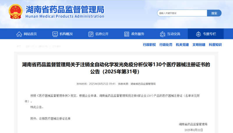 8月25日,湖南省藥監(jiān)局發(fā)布一則醫(yī)療器械注冊證注銷公告,公告顯示,該局已依法注銷湖南明德醫(yī)療器械有限公司、湖南雷杜生物技術有限公司、湖南宜樂芯康生物科技有限公司、長沙市鵬瑞生物科技有限公司等9家企業(yè)共計130個產品的醫(yī)療器械注冊證,以IVD產品居多,其中湖南明德醫(yī)療器械有限公司這一家企業(yè)共注銷了78款產品(含體外診斷設備及體外診斷試劑),其他企業(yè)注銷的產品包括醫(yī)用紅外耳溫計、特定電磁波治療器、掌上彩色多普勒超聲顯像儀等,具體明細如下: