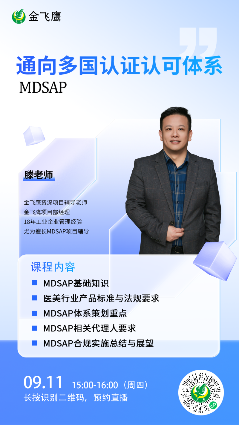 9月11日下午3點,金飛鷹高級項目咨詢師、有著諸多MDSAP項目輔導經(jīng)驗的滕老師,給大家深入淺出地講解MDSAP審核的核心邏輯與應對技巧,讓您不僅“知其然”,更“知其所以然”!感興趣的朋友記得提前預約,鎖定這場合規(guī)必修課!