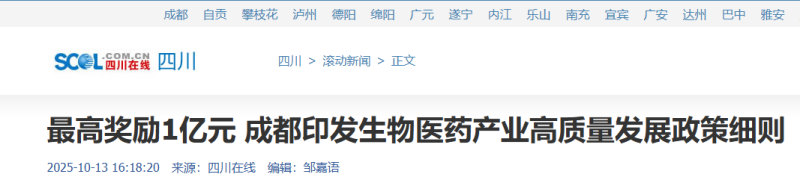 近日,《成都市促進(jìn)生物醫(yī)藥產(chǎn)業(yè)高質(zhì)量發(fā)展若干政策措施實(shí)施細(xì)則》正式印發(fā),為成都生物醫(yī)藥產(chǎn)業(yè)發(fā)展注入強(qiáng)勁動(dòng)力。這份細(xì)則針對(duì)藥械研發(fā)創(chuàng)新、臨床研究質(zhì)效和企業(yè)發(fā)展壯大三大關(guān)鍵環(huán)節(jié),推出了13類專項(xiàng)支持政策,明確各項(xiàng)政策的支持對(duì)象、申報(bào)條件和支持標(biāo)準(zhǔn),為企業(yè)提供清晰指引。其中最引人注目的是對(duì)1類創(chuàng)新藥的獎(jiǎng)勵(lì)措施:按臨床前研究、Ⅰ期、Ⅱ期、Ⅲ期臨床試驗(yàn)四個(gè)階段研發(fā)投入的20%分別給予最高300萬元、300萬元、500萬元、700萬元獎(jiǎng)勵(lì)。若納入突破性治療藥物程序并首次取得藥品注冊(cè)證,還可再獲得100萬元獎(jiǎng)勵(lì),單個(gè)企業(yè)每年最高獎(jiǎng)勵(lì)可達(dá)1億元。